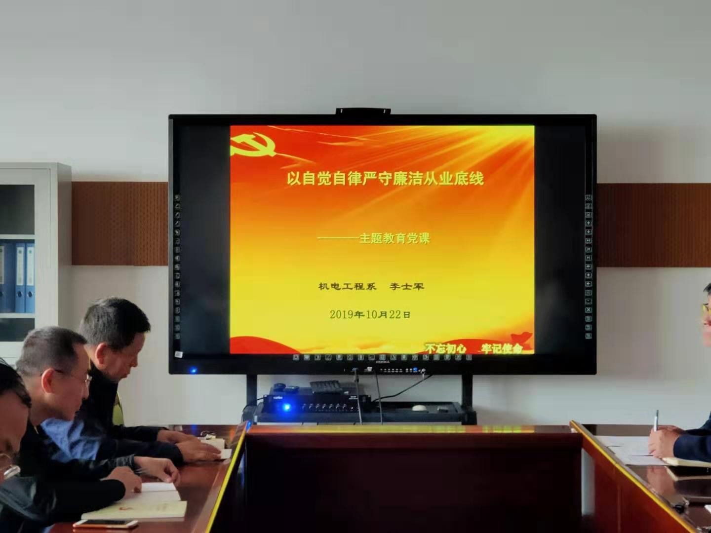 10月22日,正值学院“不忘初心、牢记使命”主题教育如火如荼开展之际,机电工程系党总支副书记李士军同志应邀为机电工程系全体党员上了一堂名为《以自觉自律严守廉洁从业底线》的专题党课,机电工程系20余名党员参加。