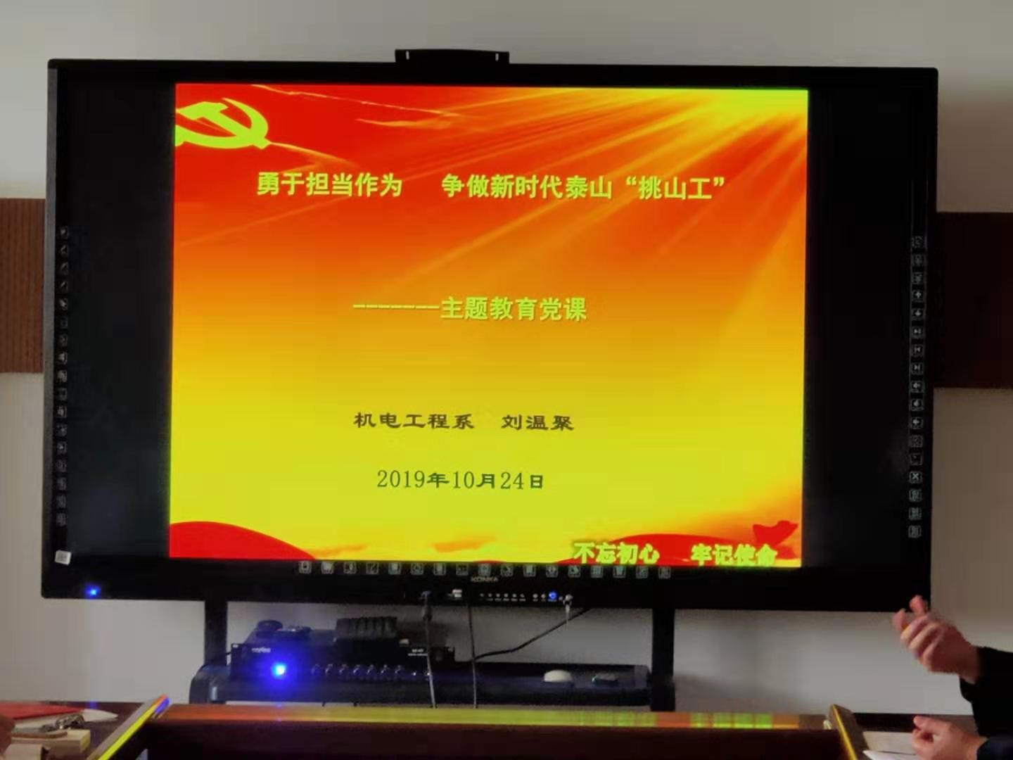 10月24日,机电工程系党总支书记刘温聚同志应邀为机电工程系全体党员上党课,进行“勇于担当作为,争做新时代泰山“挑山工””党课教育,机电工程系20余名党员参加。