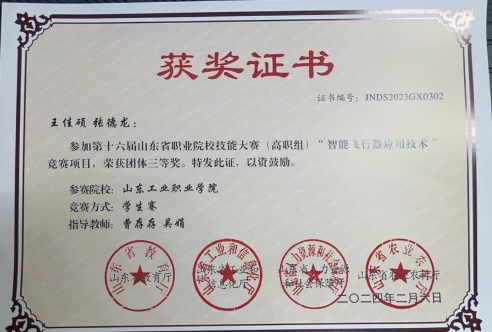 2023年12月4日 ,在第十六届山东省职业院校技能大赛高职组“智能飞行器应用技术”赛项中,由曹存存和吴娟老师指导的王佳硕和张德龙同学表现出色,凭借他们的才华和努力,一举夺得省级三等奖,为学院争得了荣誉。
